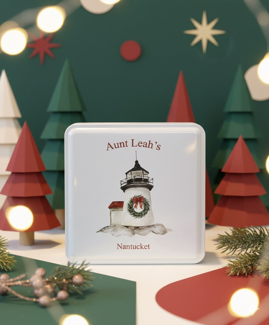 Celebrate the season with our limited-edition Brant Point Tin, featuring a festive illustration of Nantucket’s iconic lighthouse. Each tin holds 1 pound of your choice: our rich, creamy handmade fudge, our signature chocolate-covered cranberries, or a mix of both.